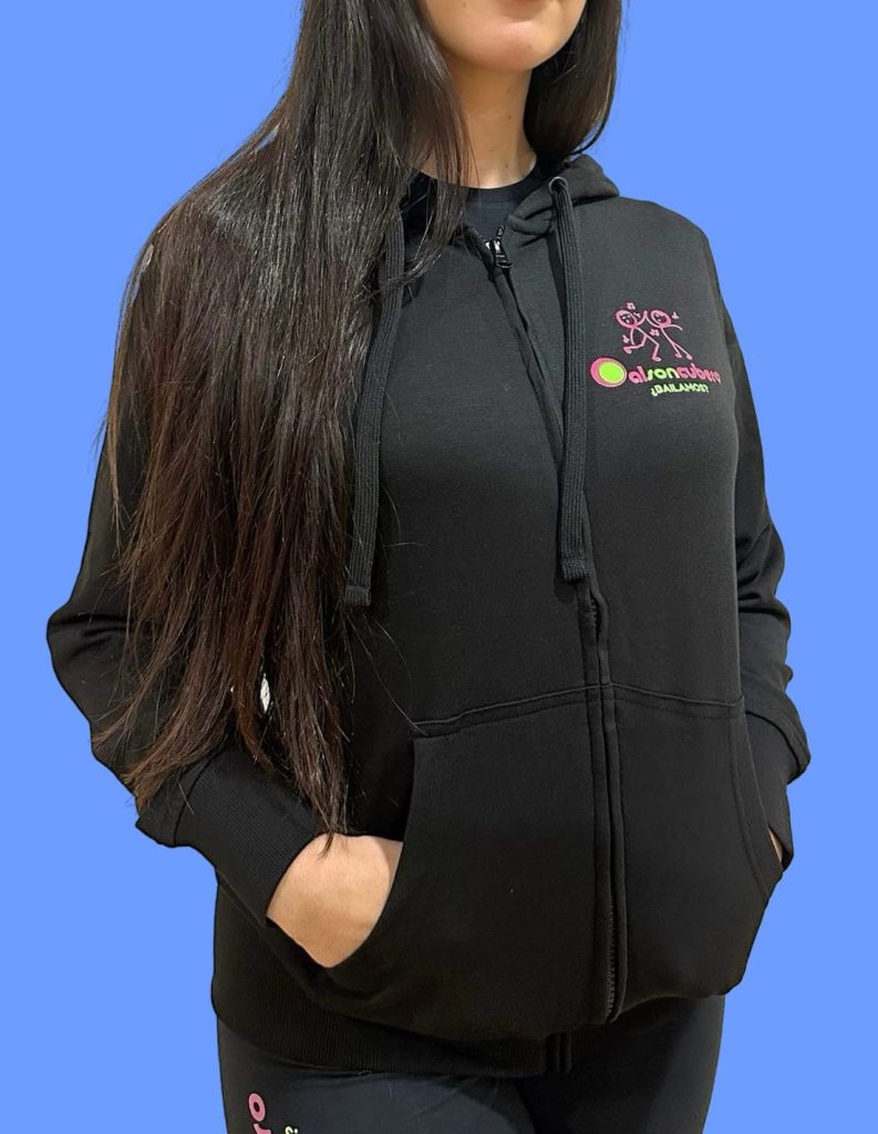 Sudadera con capucha y cremallera, personalizada en pecho a 9 cm y espalda a 22cm. con los logos de la Academia de baile Al Son Cubero.